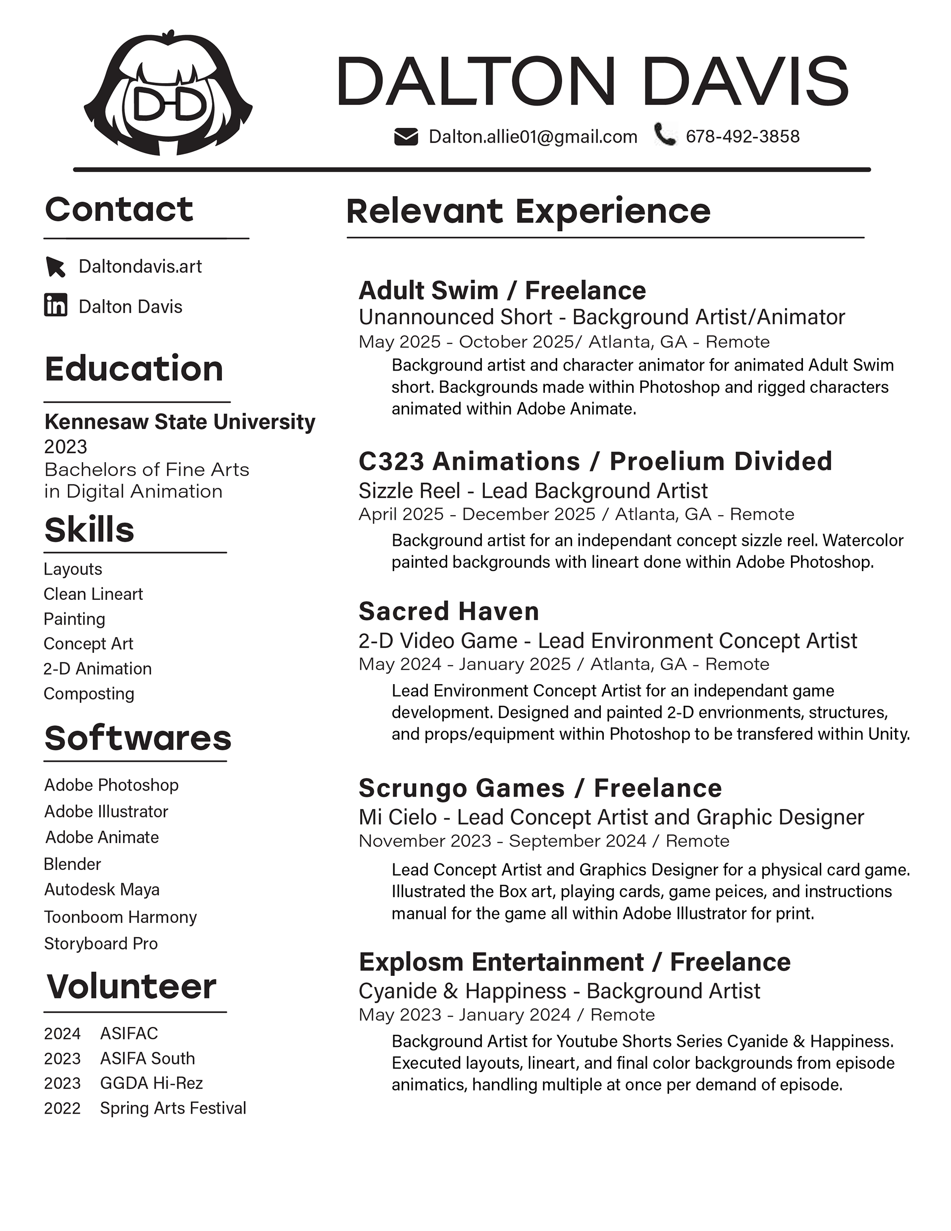 Hello! I'm a Freelance Background Artist from Atlanta, GA. Since graduating from Kennesaw State University in Digital Animation, I've worked on many different collaborative projects including the Youtube series Cyanide & Happiness, an Unannounced Short with Adult Swim, and even within the game industry as a concept artist for Sacred Haven! I am currently volunteering as an On-Site Coordinator for ASIFA-South, an animation non-profit organization that runs monthly meetings to bring our animation community together here in the south. I am a passionate individual about art and my community, and always looking for new opportunities to expand on my art!